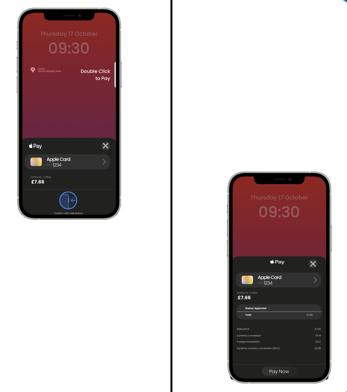 A concept to enhance Apple Pay for international travelers, allowing purchases in home currency with a clear breakdown of conversion fees and charges for transparent transactions abroad.